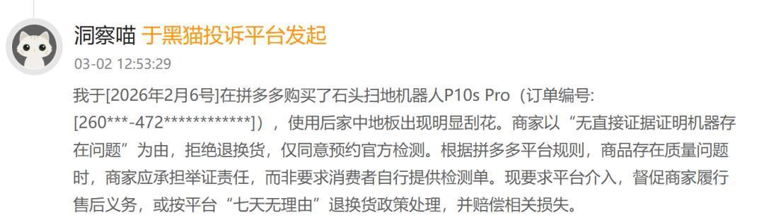 比如,有消费者反映,花费两千多元购买的石头洗拖一体机在两个月内4次返厂维修;亦有用户抱怨,新购的P10s Pro扫地机器人划伤地板,售后却以“无直接证据证明机器存在问题”为由拒绝退换。