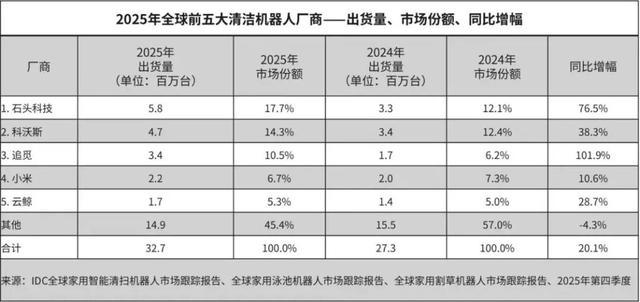 根据IDC最新报告,2025年,全球智能扫地机器人市场整体出货量达到 3272 万台,石头科技以580万台的量级,夺得17.7%的份额,稳居行业第一;排在二至四名的分别是科沃斯、追觅、小米和云鲸,对应市场份额14.3%、10.5%、6.7%、5.3%。