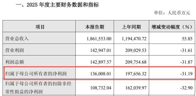 业绩快报显示,石头科技2025年归母净利润为13.60亿元,同比骤降31.19%,为2020年上市以来最大年度跌幅,且2024年、2025年连续两年下滑,2025年跌幅显著扩大。