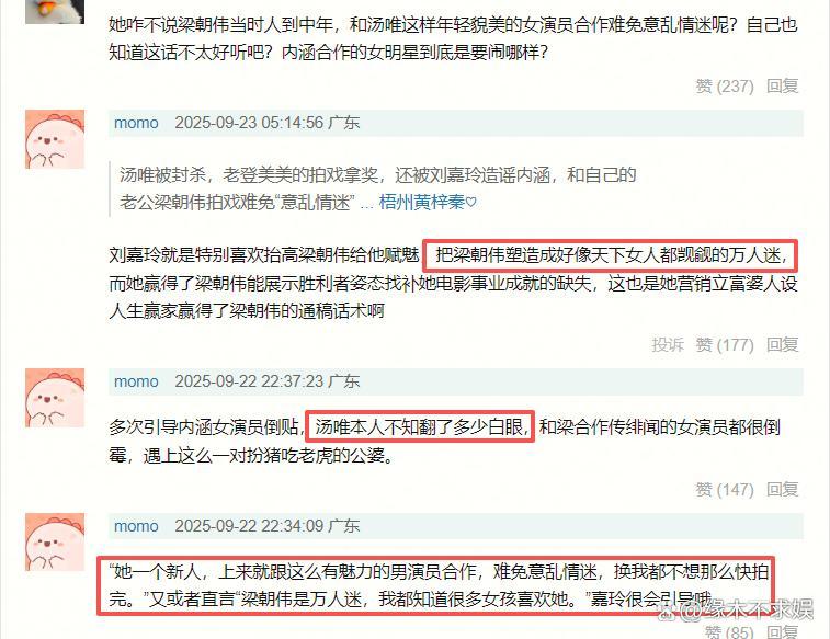 不过网友却吐槽刘嘉玲这是给梁朝伟赋魅,要把老公塑造成天下女人都觊觎的万人迷。其实汤唯对梁朝伟压根没有非分之想,完全是刘嘉玲引导的。