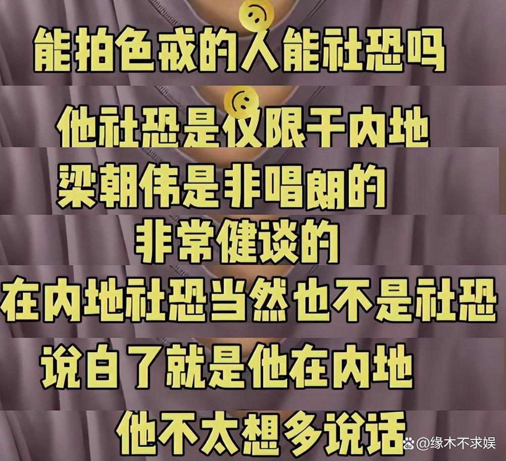 关于梁朝伟社恐一说,也有博主称他只是在内地社恐,其实本人是十分开朗健谈的。作为一名演员,他也不可能社恐,否则很多戏都拍不了。他只是在内地不太爱说话,在国外领奖台却能侃侃而谈。